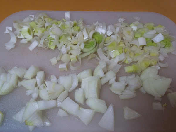 Limpiamos el puerro y los cortamos en cuadraditos. Hacemos lo mismo con la cebolla.