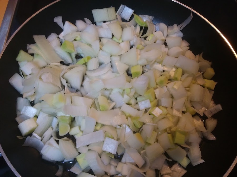 Ahora vamos a pochar en una sartén con un chorrito de aceite de oliva los puerros y la cebolla.
