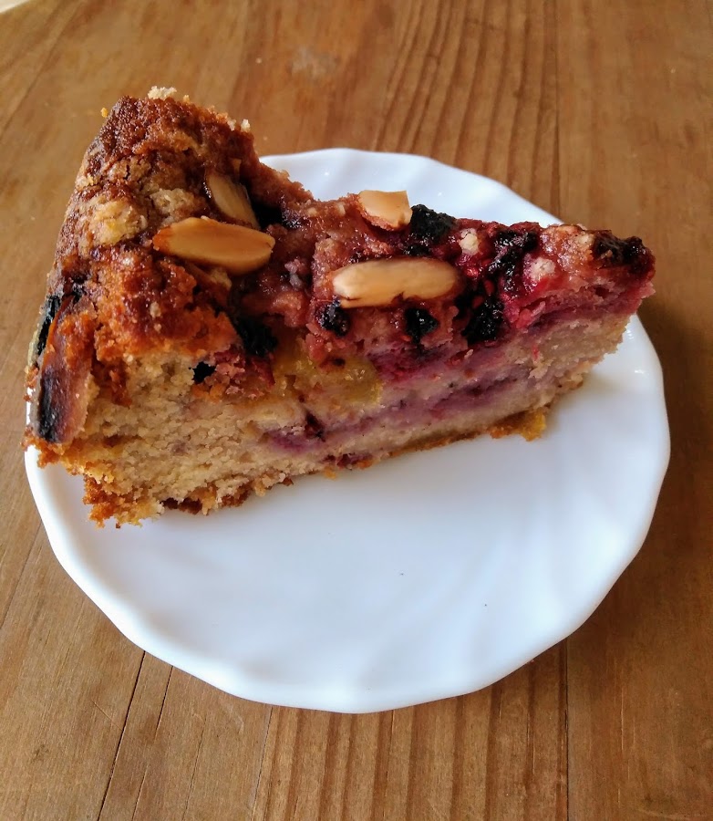 Para el pastel mezclamos la mantequilla con el azúcar hasta que quede una masa pálida y suave. Podemos usar la batidora de varillas. Añadimos el huevo poco a poco batiendo cada vez. Ponemos el extracto de vainilla y seguimos batiendo. En un recipiente aparte tamizamos la harina y echamos a la harina la levadura en polvo y la almendra molida. Ahora vamos añadiendo cucharadas de esta mezcla a la mezcla anterior alternando con el yogur. Esto no lo batimos con la batidora sino que lo vamos incorporando y moviéndolo con la ayuda de una cuchara o paleta.