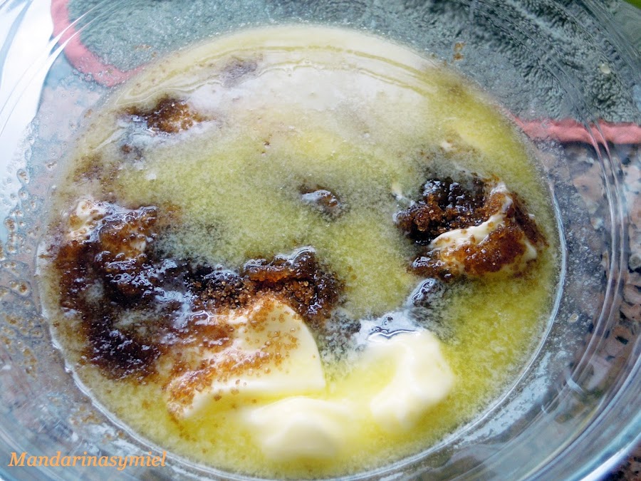 Pon en un bol la mantequilla, el azúcar y la miel, bate con una batidora hasta que obtengas una crema ligera.