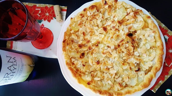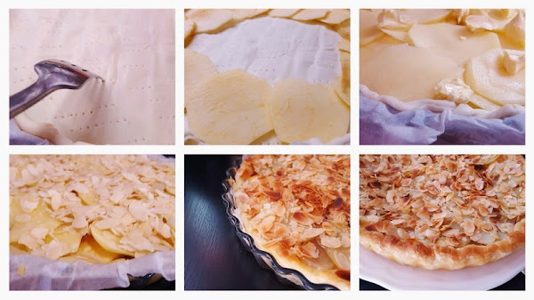 2.-Disponemos sobre el hojaldre una capa de rodajas de papas, le añadimos trozos de mantequilla, cubrimos con una capa de manzanas y repartimos un poco de mantequilla por encima. Repetimos la operación, la última capa tiene que ser de papas. Sobre las papas disponemos las láminas de almendras. Cocinamos el pastel de hojaldre 40 o 45 minutos con el horno precalentado a 180ºC hasta que el hojaldre esté dorado y las almendras también. lo retiramos del horno y servimos en porciones.
