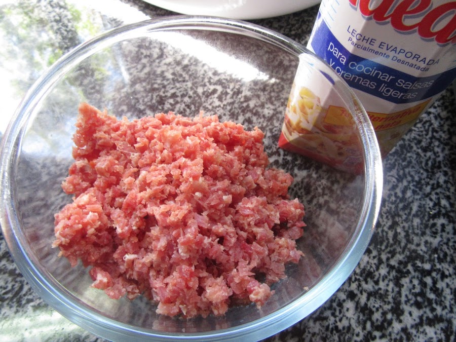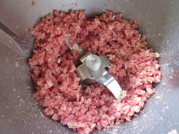 1- Moler el jamón serrano en trozos, con golpes de turbo. Ir mirando, según os gusten los trocitos que se noten más o menos. Reservar.
