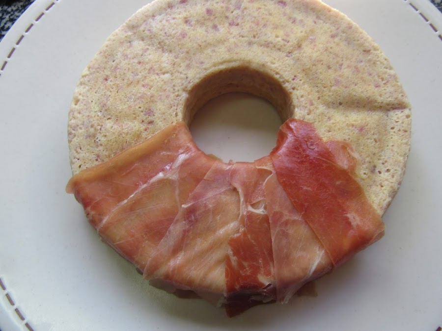 2- Sin lavar el vaso, huevos, leche ideal, pan de molde en trozos, brandy y pimienta, 20 seg. vel.6. Añadir el jamón y mezclar 4 seg. vel.4. (No se pone nada de sal, con la del jamón es suficiente).