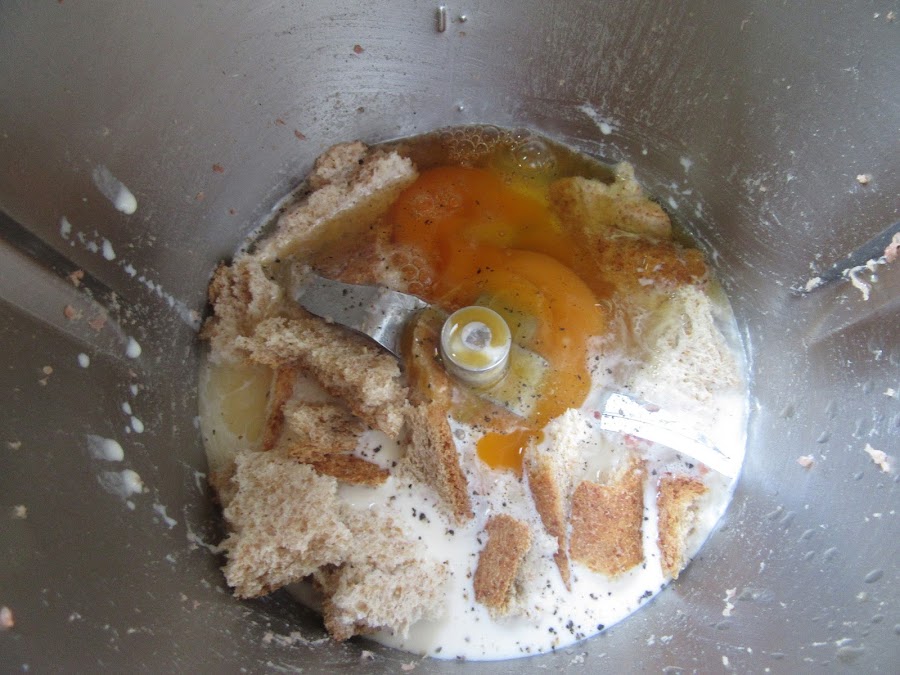 2- Con el turmix, mezclar los huevos, leche ideal, pan de molde en trozos, brandy y pimienta, que quede una masa fina y sin grumos. Añadir el jamón y mezclar bien. (No se pone nada de sal, con la del jamón es suficiente).