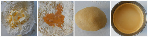 Colocamos en un bol la harina con el azúcar y añadimos la mantequilla fría troceada. La desmenuzamos con los dedos o con un tenedor hasta que tenga una textura arenosa. Batimos ligeramente el huevo junto con la esencia de vainilla y lo agregamos uniendo bien todos los ingredientes. Obtendremos una masa suave que no se pega a los dedos. Sobre la encimera (mesada) la estiramos con un rodillo dandole forma circular para cubrir con ella el molde.