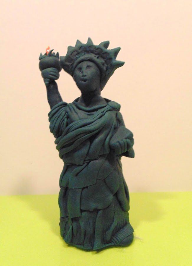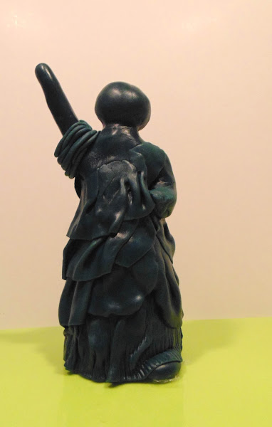 Para hacer el brazo alzado y que no se caiga ponemos un palillo de brocheta sobre el cual construimos el brazo y la antorcha. Y también aseguramos con un palillo la cabeza, que es lo más difícil de hacer. En mi primer intento parecía un mono con peluca!!!! así que a no desfallecer y si no sale bien a la primera, pues se vuelve a intentar.