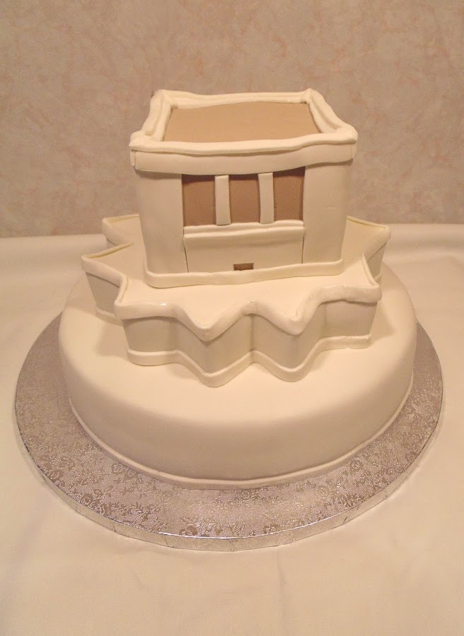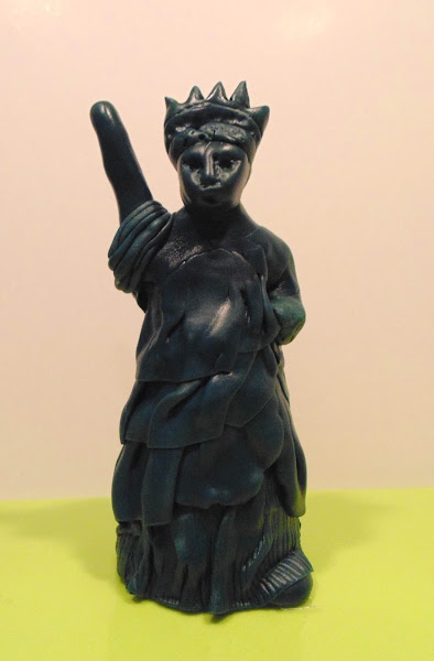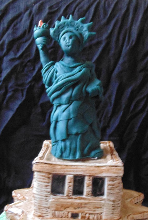 Bueno, el pastel propiamente dicho es la base de la estatua y la isla. Concretamente son 3 pasteles, tal y como puede verse en esta foto de un momento en el que aún no le había dado color. La estatua está modelada en fondant y os explico como: