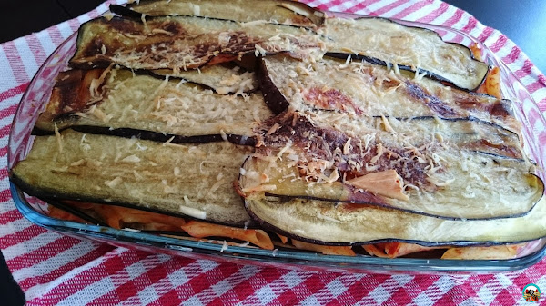 4.- En un fuente de horno ponemos una capa de berenjenas asadas, las cubrimos con macarrones en salsa. Añadimos unas cucharadas de queso rallado por encima. Volvemos a poner otra capa de berenjenas y otra de macarrones, añadimos el queso y cubrimos con una última capa de berenjenas. Esparcimos por encima el queso y cocinamos en el horno 15 minutos más a 180ºC. Retiramos el pastel de macarrones con berenjenas y servimos en porciones.
