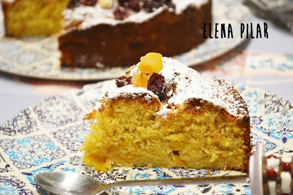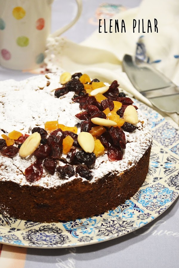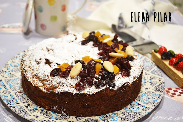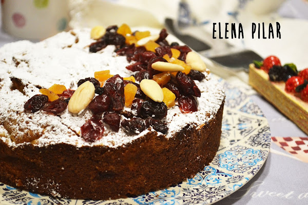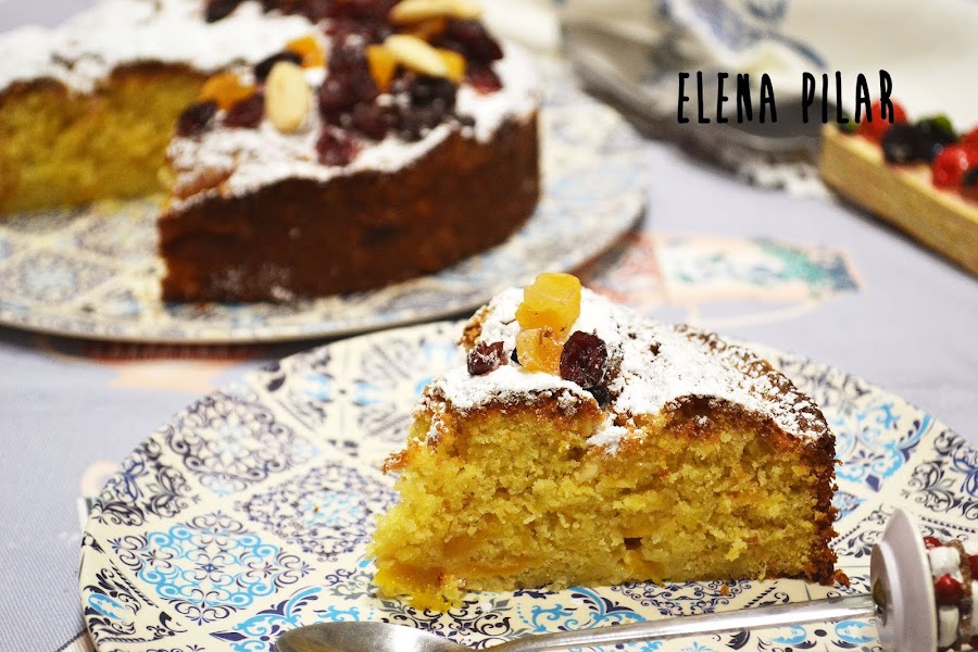 Horneamos unos 40 minutos a 170ºC. Dejamos enfriar por completo antes de desmoldar. Antes de servirlo lo espolvoreamos con azúcar glas y decoramos con frutas deshidratadas variadas y unas almendras enteras.