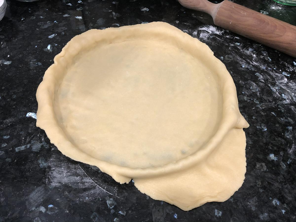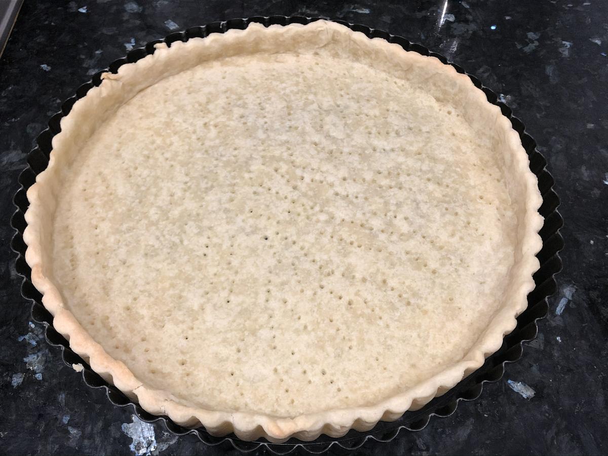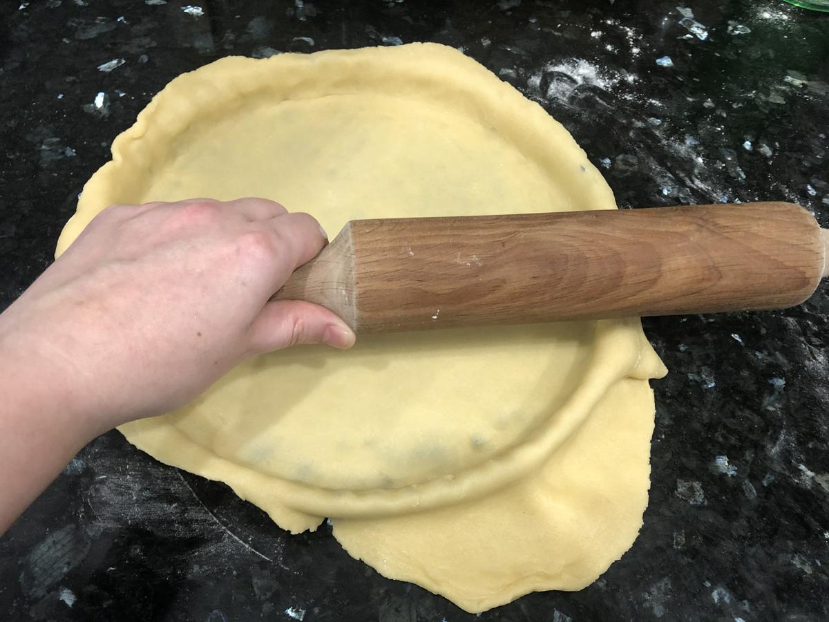 4. Engrasamos un molde desmontable y con la ayuda del rodillo (enrollando la masa en él) pasamos la masa al molde. Ajustamos bien, presionando por las paredes con las yemas de los dedeos. Para recortar lo sobrante de los extremos, pasamos el rodillo por todo el canto del molde. Yo este sobrante de masa, lo he puesto en film y lo he congelado para otro día hacer una mini tartaleta con lo que me de el punto.