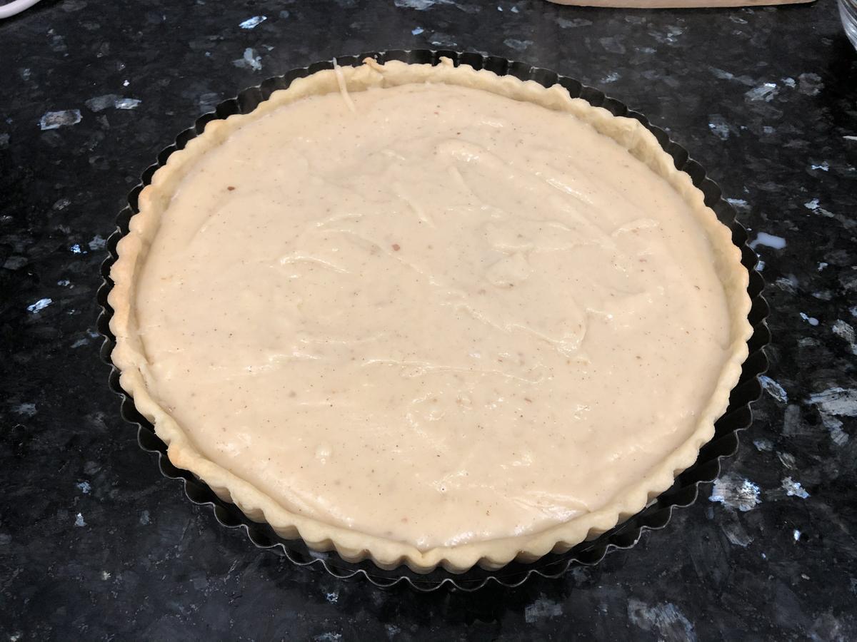 6. Seguidamente, sin demorar para que no empiece a enfriarse, vertemos esta crema encima de nuestra base. Repartimos bien por todos los huecos, que quede lo más uniformemente posible.