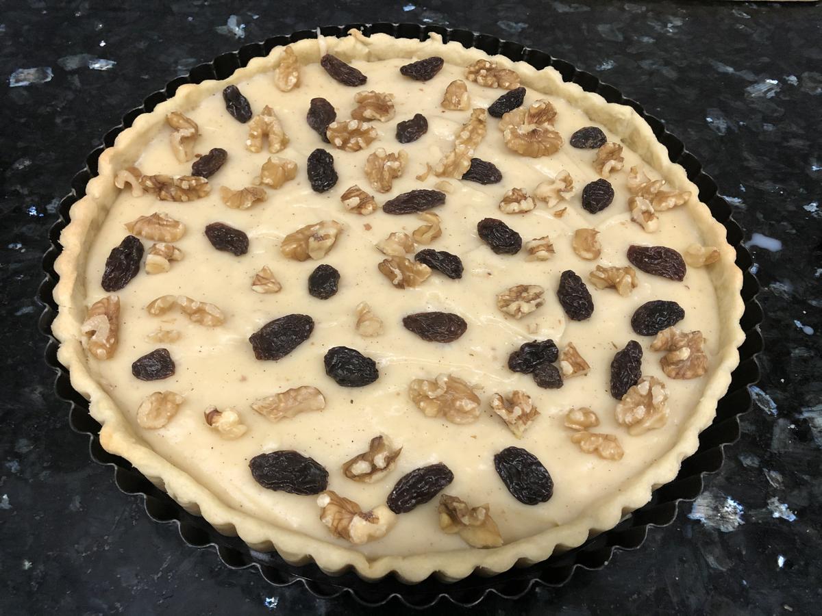7. Espolvoreamos con las pasas y las nueces. Estas últimas podemos romperlas un poquito con las manos si son muy grandotas. Una vez las hayamos repartido, apretamos un poquito con los dedos para que se hunda en la crema.
