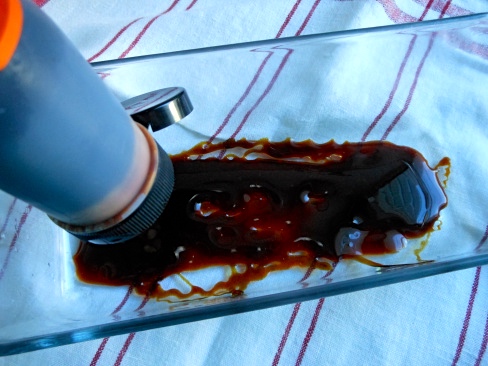 A continuación cubre el fondo del molde rectangular con caramelo líquido y vierte la mezcla de huevos y manzana.