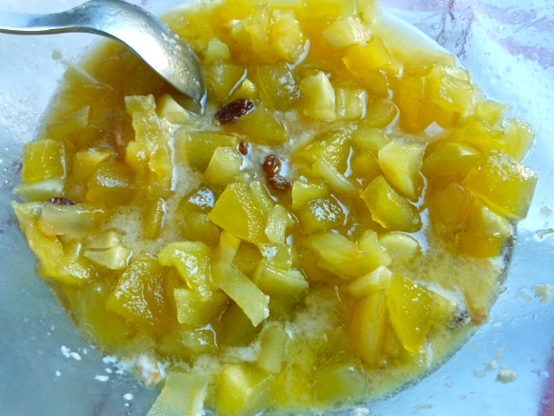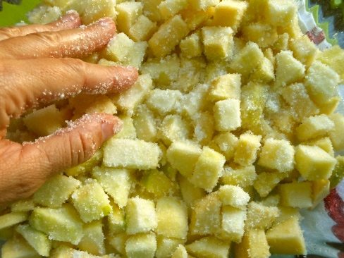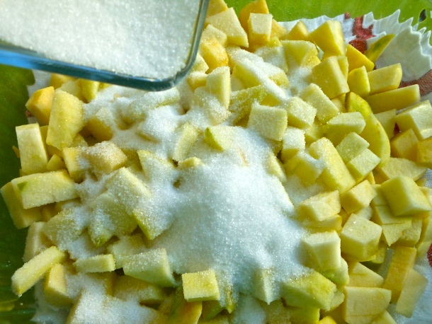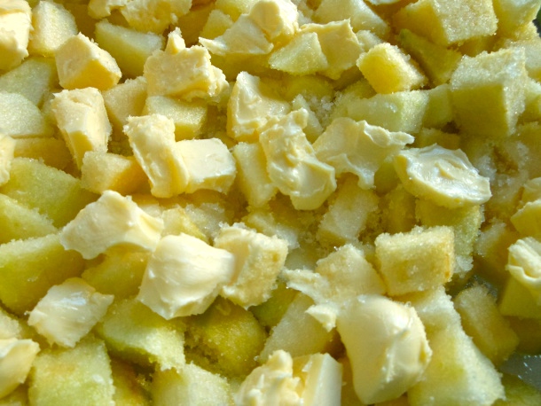 Después mezcla todos los ingredientes usando tus manos de forma que todos los trocitos de manzana queden impregnados del azúcar y la mantequilla.