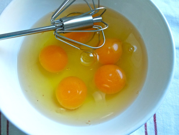 Seguidamente casca los cinco huevos sobre un bol y bátelos.