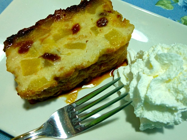 Este pastel se puede tomar templado o frío, acompañado de nata montada (crema de leche) o de una bola de helado de vainilla.