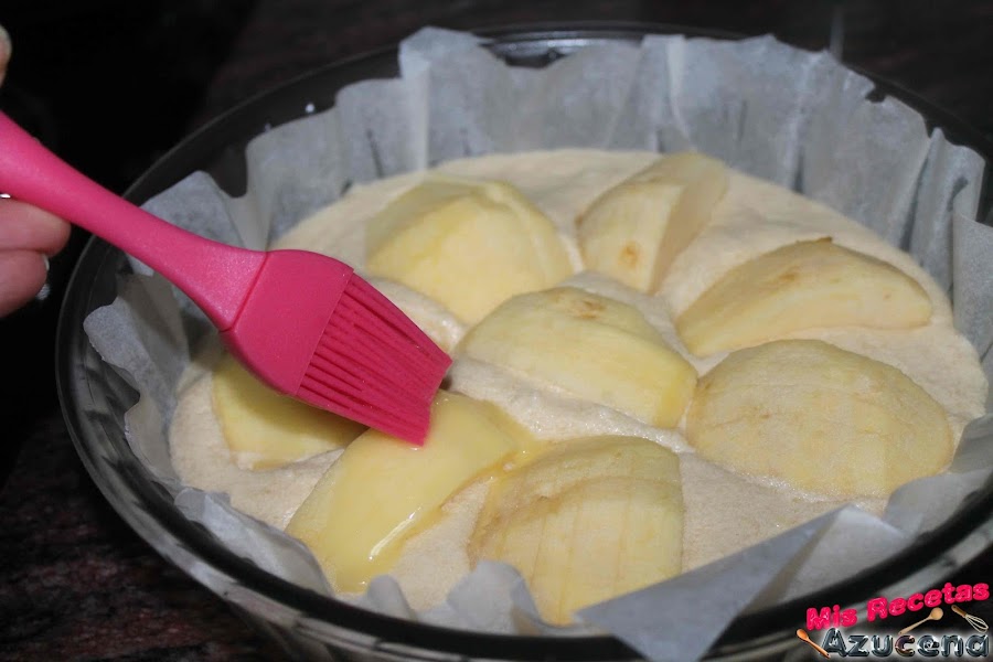 La mantequilla que teníamos reservada la fundiremos en el microondas sin que llegue a calentarse mucho y con ayuda de una brocha pintaremos las manzanas y la masa, por último espolvorearemos por encima una capa generosa de azúcar glass.