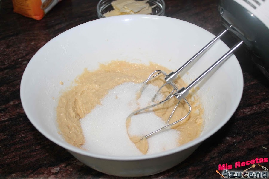 Una vez tengamos todos los ingredientes bien mezclados añadiremos el azúcar y seguiremos batiendo unos 2 minutos más para añadir la mantequilla, seguimos batiendo.