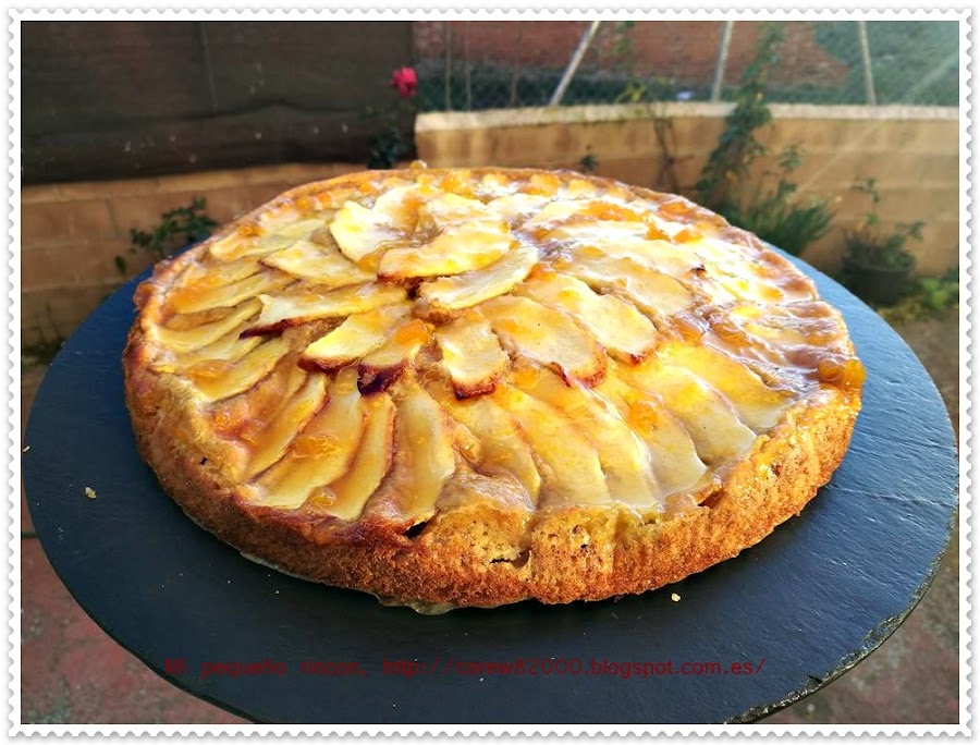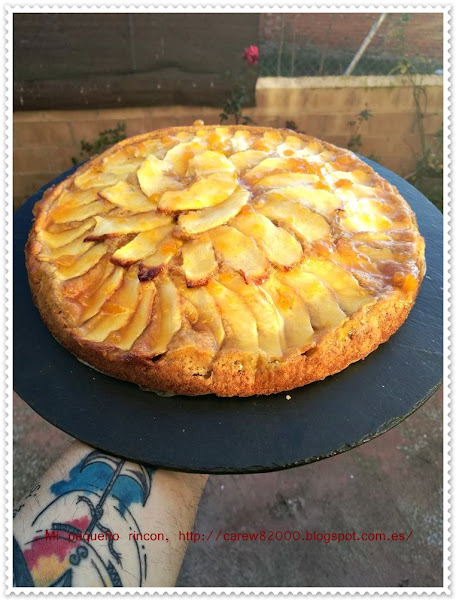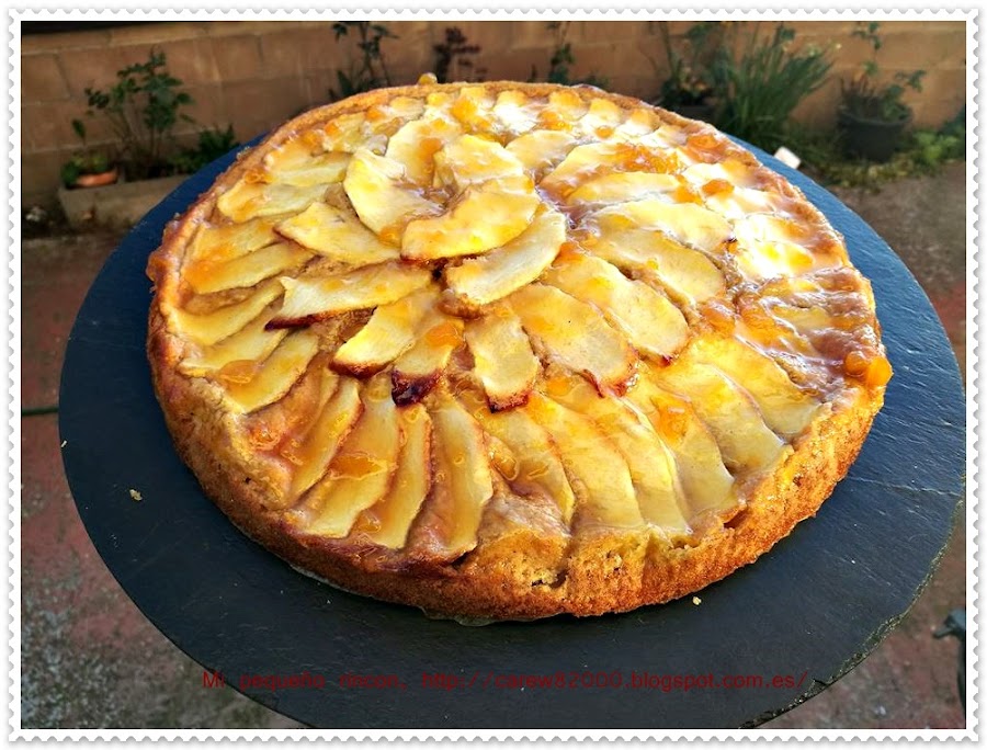 Pintamos un molde con mantequilla y le espolvoreamos un poco de harina, echamos nuestra masa y encima le ponemos laminas de manzana de las otras dos reinetas que nos quedaban, es importante cortarlas finas para que no pesen demasiado.
