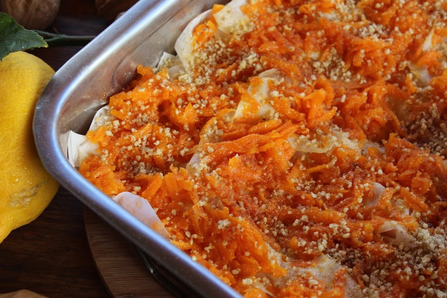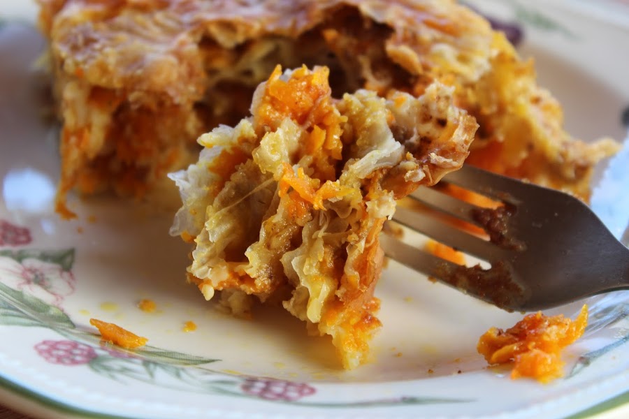 7- Cubrir con pasta filo arrugada y seguir el mismo proceso hasta terminar a calabaza. Finalmente cubrir con pasta filo.