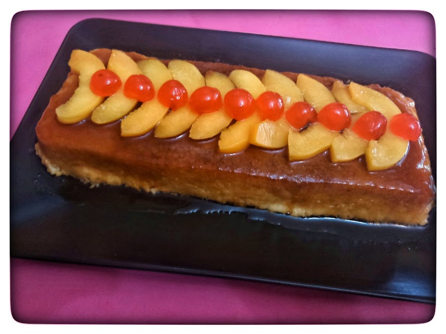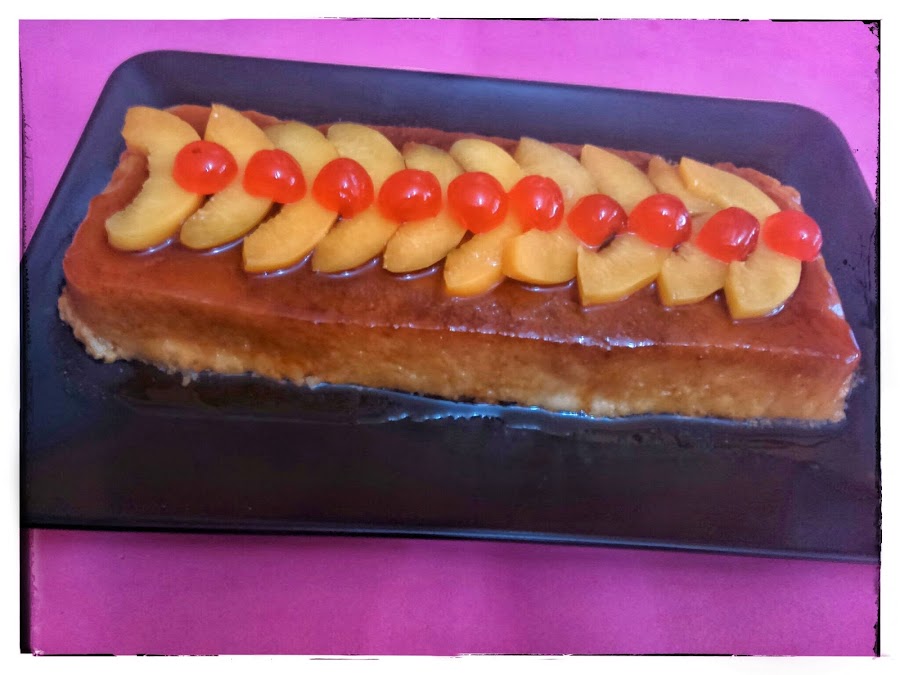 Pasado unos minutos y ya mas frio el molde , lo metemos a refrigerar al menos 6 horas , cuando pase ese tiempo lo sacamos y desmoldamos decorándolo con el melocotón que teníamos reservado y si queremos unas guindas , es un postre estupendo y buenísimo .