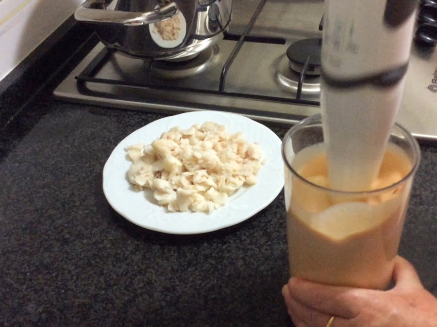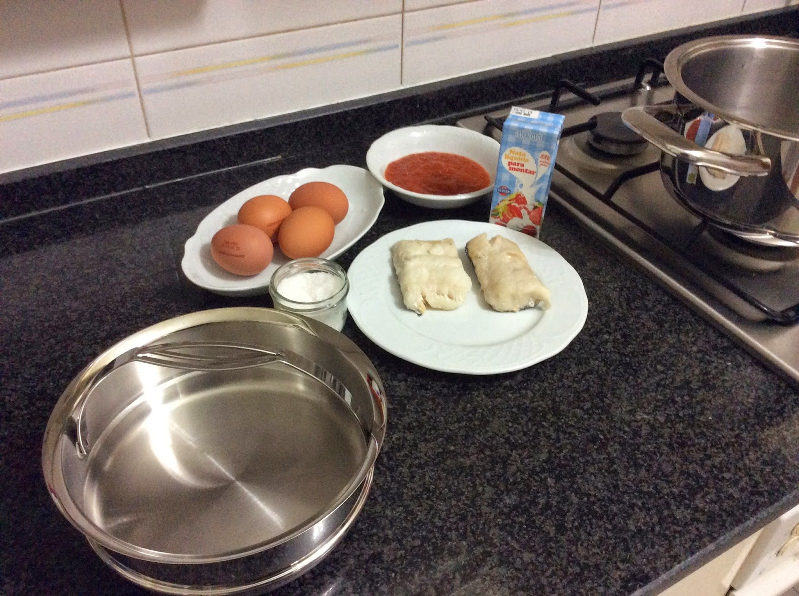 b) En un vaso batidor introducimos los huevos, la nata (crema de leche) y el tomate, batimos muy bien. Procedemos a desmenuzar la merluza y le añadimos un poco de sal, después añadimos al vaso batidor y batimos con la mezcla anterior hasta que nos quede una textura fina y homogénea.