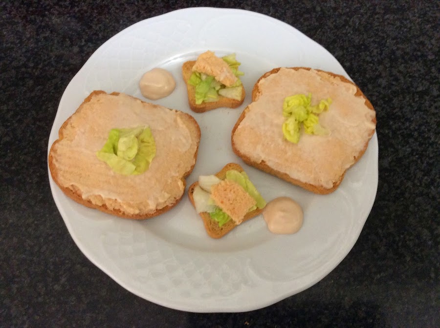 e) Podemos preparar una salsa rosa con mayonesa, un poco de ketchup y un poco de zumo de naranja y decorar el pastel. La presentación corre por cuenta de la imaginación de cada uno; a la hora de servir puede hacerse en un trozo por comensal, en tostas o canapés