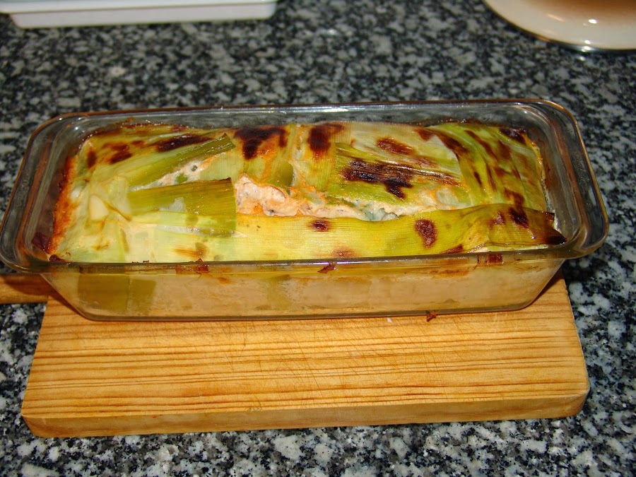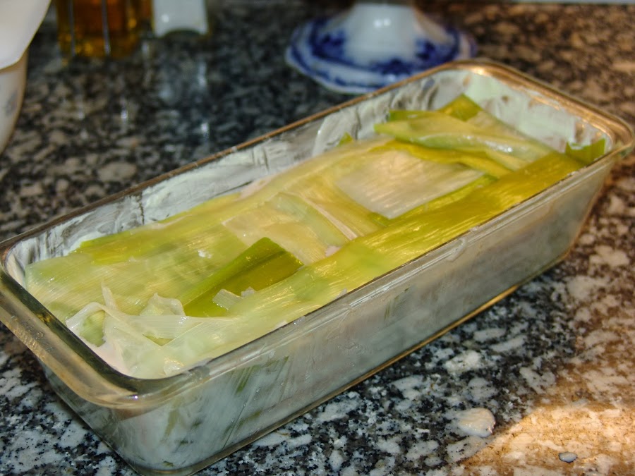Coger un molde alargado tipo cake, untarlo de mantequilla y forrar con las hojas de puerros por todos los lados y la base.