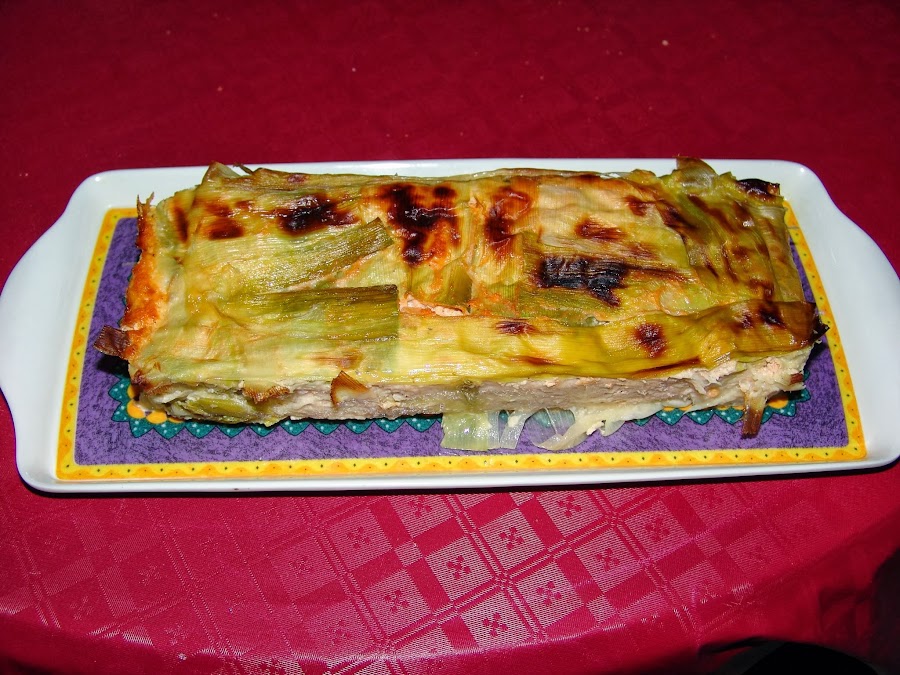 Verter la mezcla en él y cubrir con los puerros. salpimentar.
