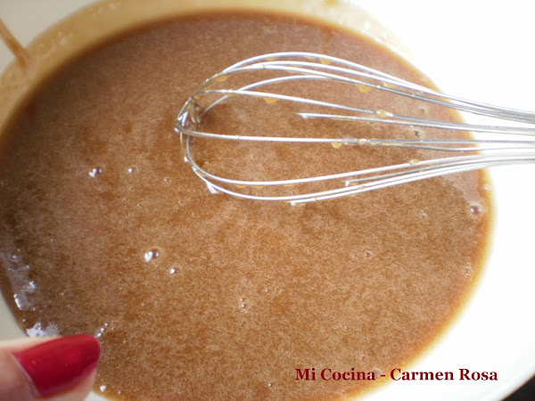 En una cacerolita poner la mantequilla, la miel y el azúcar, calentándolo a fuego lento y removiéndolo bien hasta que la mantequilla se haya derretido y todo esté bien mezclado.