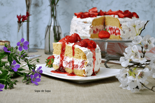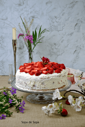 Cubrir la parte de abajo con la nata (crema de leche) con fresas y volver a colocar la otra mitad encima. Si tienes un aro de pastelería te será más fácil repartir el relleno.