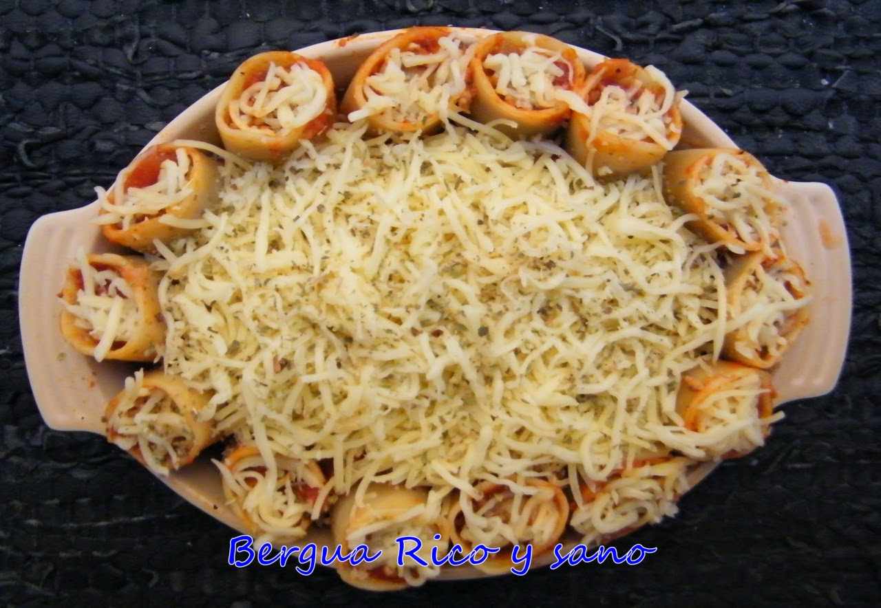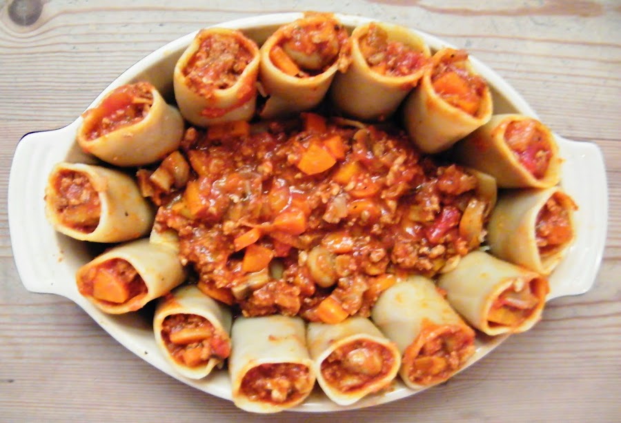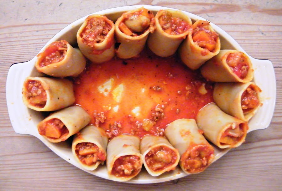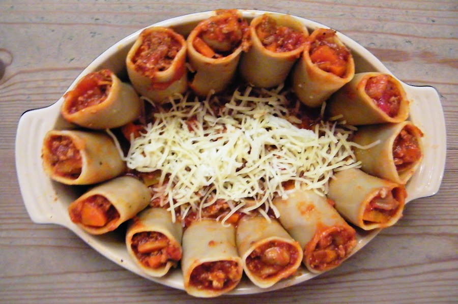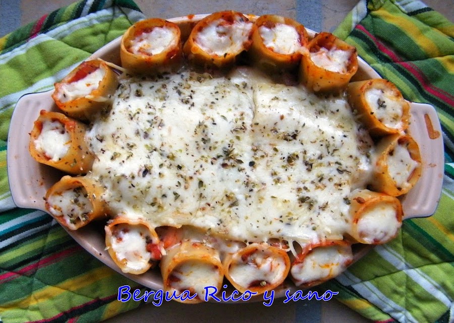Esta receta la hice para mi vikingo y está hecha a su gusto, mucha carne y mucha pasta. El paccheri es un tipo de pasta, parecido a los canelones, pero más cortos y gruesos. Por eso es más fácil que se mantengan en pie y vienen genial para estas presentaciones. La verdad es que salió muy bueno el invento y me sirvió para reciclar las sobras de la salsa de picadillo y tomate que hicimos el día anterior ;) Para 3-4 comensales.