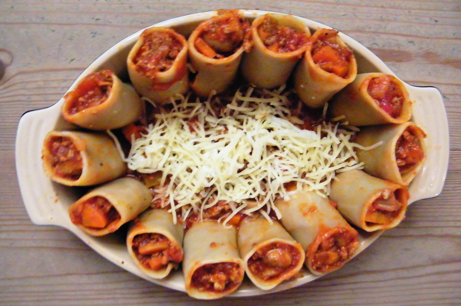 4. Podemos hacer el pastel completo de paccheri relleno, pero como a mi vikingo le encanta la lasaña, yo hice un híbrido. Los paccheri que me quedaban los corté en un lateral y los utilicé como láminas de lasaña en el hueco del centro.