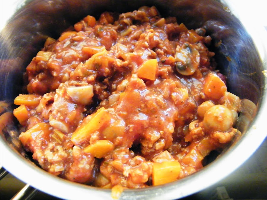1. Mi salsa eran sobras del día anterior, pero básicamente cortamos los ingredientes, con una pizca de aceite pochamos la cebolla y el puerro, añadimos el ajo. Entonces añadimos la carne, al cabo de unos minutos las verduras y finalmente la salsa de tomate con los condimientos y cocemos hasta que todo esté cocinado.