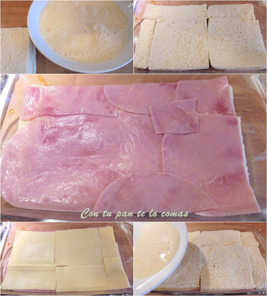 4. Hacemos capas de jamón de york y queso, las que queramos según el tamaño del molde. Acabamos con una capa de pan y regamos con lo que nos ha quedado de los huevos.