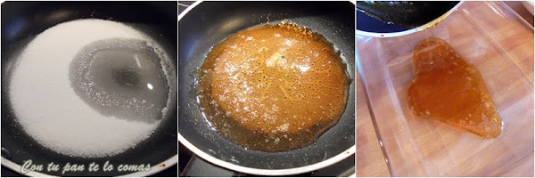 1. Para hacer el caramelo ponemos en una sartén el azúcar con una cucharada de agua. Dejamos que se vaya caramelizando hasta que tenga un tono ámbar, mejor no pasarse de oscuro porque entonces amargaría un poco.