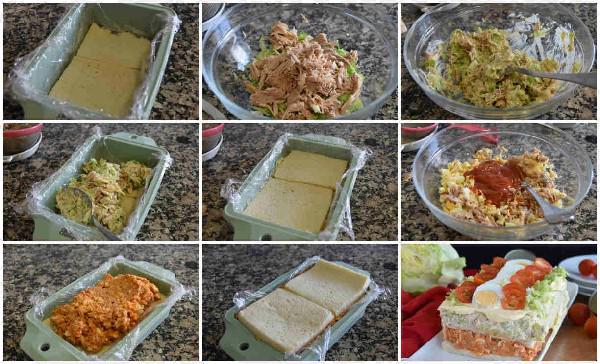 Forramos un molde con papel transparente de cocina y en la base de esta ponemos 2 rebanadas de pan de molde.Picamos la lechuga en trozos pequeños, le añadimos la mitad del atún escurrido y desmigado y 1 o 2 cucharada de mahonesa, mezclamos y extendemos sobre la primera capan de pan.