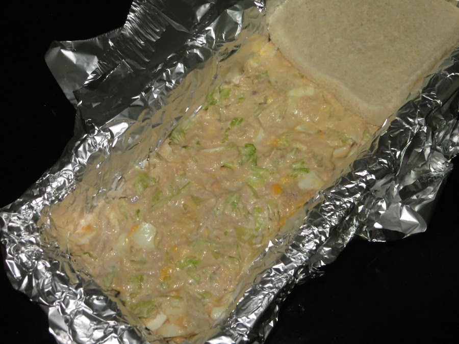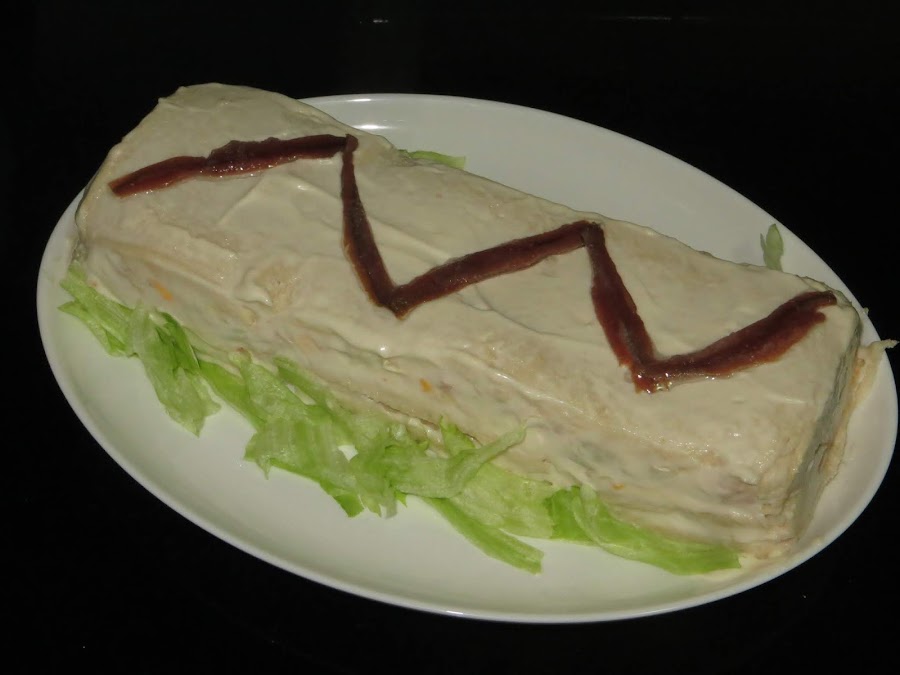 Cubrimos un molde rectangular con papel film para que luego sea más fácil desmoldar el pastel, colocamos tres rebanadas de pan de molde y echamos la mezcla anterior. Colocamos otras tres rebanadas de pan de molde, le untamos un poco de tomate frito y colocamos las lonchas de pavo y los tranchetes, colocamos las otras tres rebanadas de pan de molde. Tapamos y colocamos encima algo con peso para que el pastel quede bien prensado. Se mete al frigorífico hasta la hora de servir, luego se da la vuelta se unta de mayonesa y se adorna con anchoas y lechuga y ya está listo para servir.