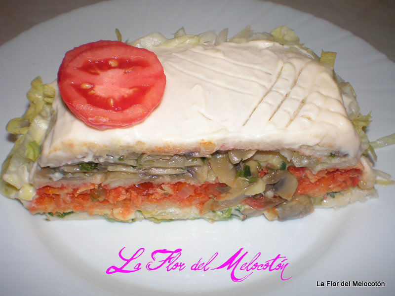 Hacemos otra capa de pan, mojamos un poquito con el tomate, y echamos el relleno que no hayamos puesto en la capa anterior. Otra capa de pan con tomate, la lechuga y otra capa más de pan.