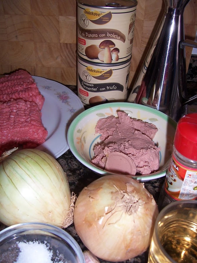 En esta ocasión estuve dudando en prepararlo con el de trufa pero al final me decidí por el Puré de Patatas con Boletus, para el relleno utilicé el de carne picada con paté de hígado de cerdo, que me encanta, creo que ya lo he utilizado para alguna empanada, pero realmente te vale cualquier relleno que se te ocurra, de verdura, de pescado, puedes coger muchas ideas con los rellenos de las empanadas como hice yo y con los sabores del puré. Por ejemplo con Puré de Patatas con Pimientos relleno con lechuga muy picadita y atún........¿rico No?, bueno vamos con la receta.