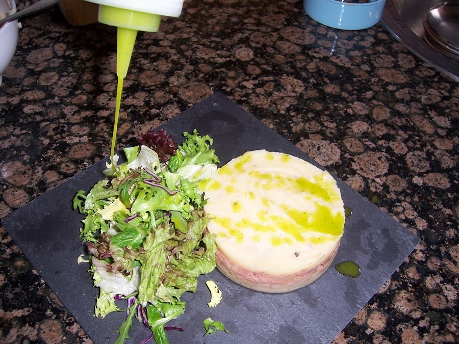 En un aro de emplatar ponemos el puré de patatas, la carne y cubrimos con el puré de patatas, prensamos bien y retiramos el aro.