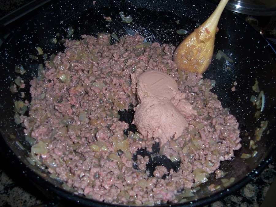 Una vez lista la carne añadimos el paté y lo mezclamos todo bien.