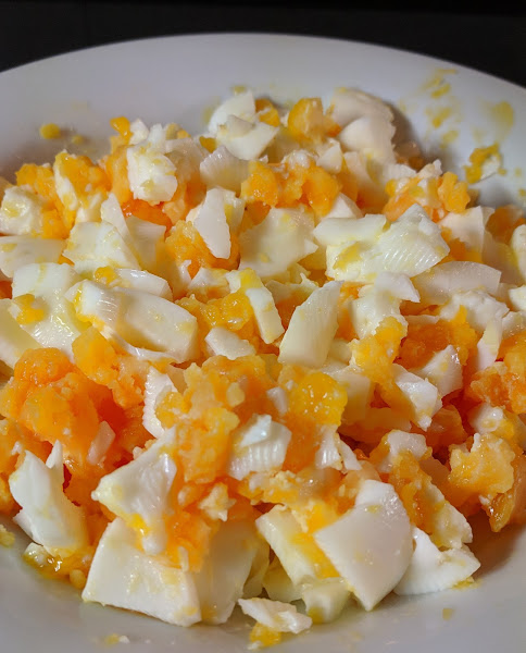 Como ya estarán fríos los huevos córtalos en trozos como te muestro en la foto