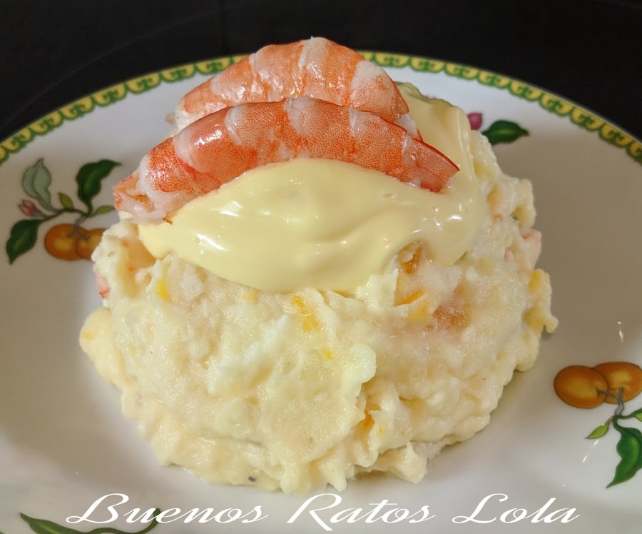 Si ves que está muy seca añade una cucharada del caldo. Pon el resto de ingredientes y la mitad de la mayonesa. No debe quedar bañado en mayonesa, la mezcla es espesa. Pon en el centro del plato poco a poco para hacer una bonita forma. Corona con una cucharada de mayonesa y uno o dos langostinos