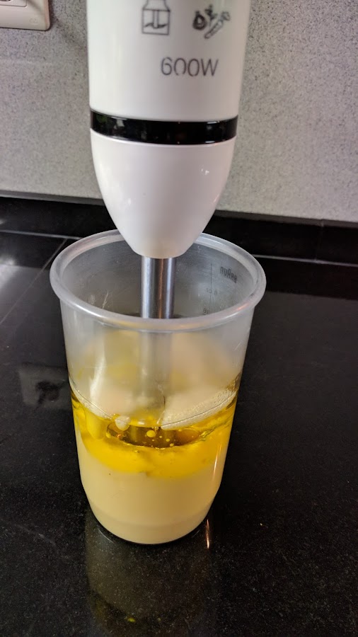 Para los que no tenéis costumbre de hacerla casera sólo tenéis que empezar a batir con la batidora apoyada en el fondo, como se ve en la foto. Cuando empieza a espesar ve subiendo poco a poco hasta la superficie y bate ya moviendo arriba y abajo unos segundos más. Verás como te sale y no se corta. Reserva en la nevera.