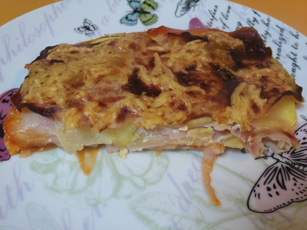 Vamos repitiendo las tandas de patata y jamón hasta terminar los ingredientes. Terminaremos con una capa de jamón cocido. Ponemos a precalentar el horno a 180 grados.