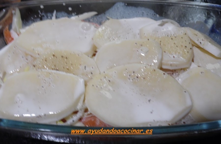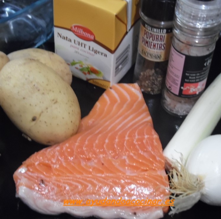 Colocar dentro del recipiente los ingredientes por capas alternas ( patata, salmón, cebolleta, puerro...)