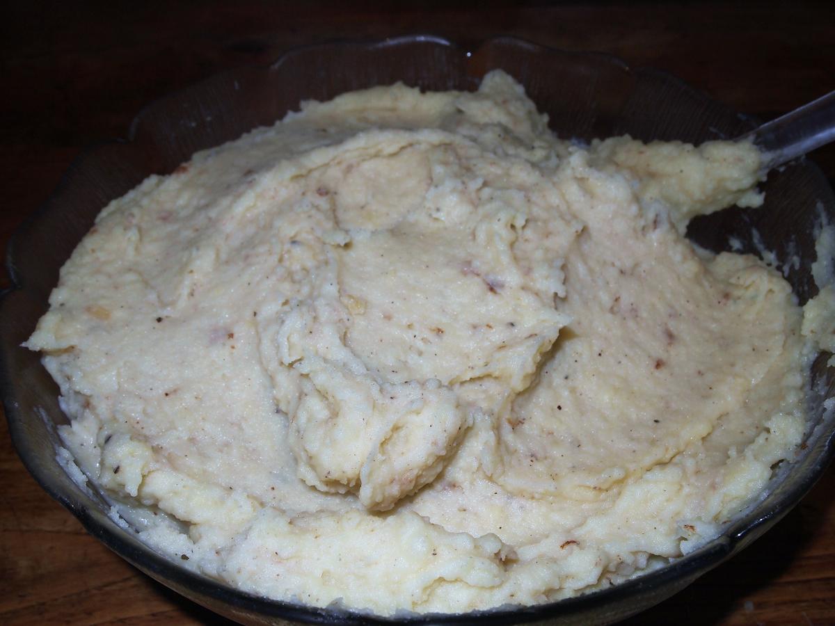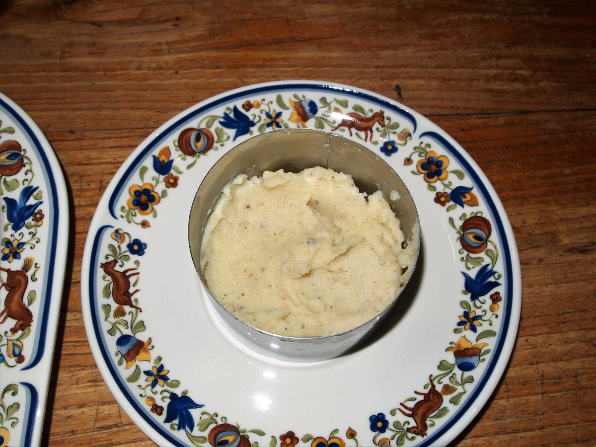 Cuando tengamos las patatas cocidas, las escurrimos y aplastamos bien con un tenedor o con un pasapuré, añadimos la leche y corregimos de sal, en este punto yo añado pimienta y un poco de nuez moscada. Si optamos por el puré de sobre es el momento de prepararlo siguiendo las indicaciones del paquete.