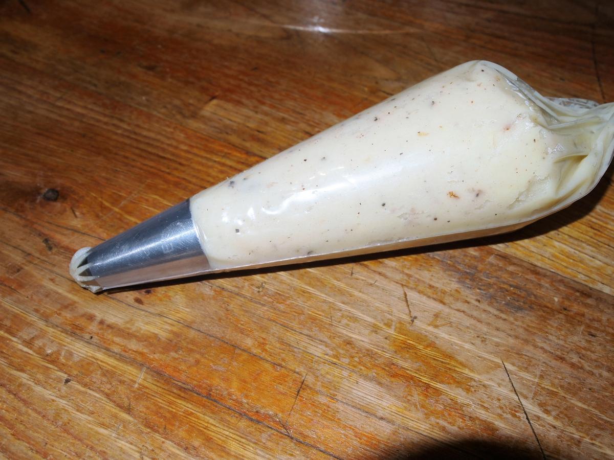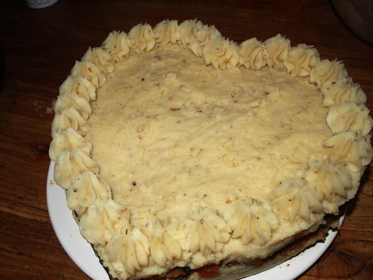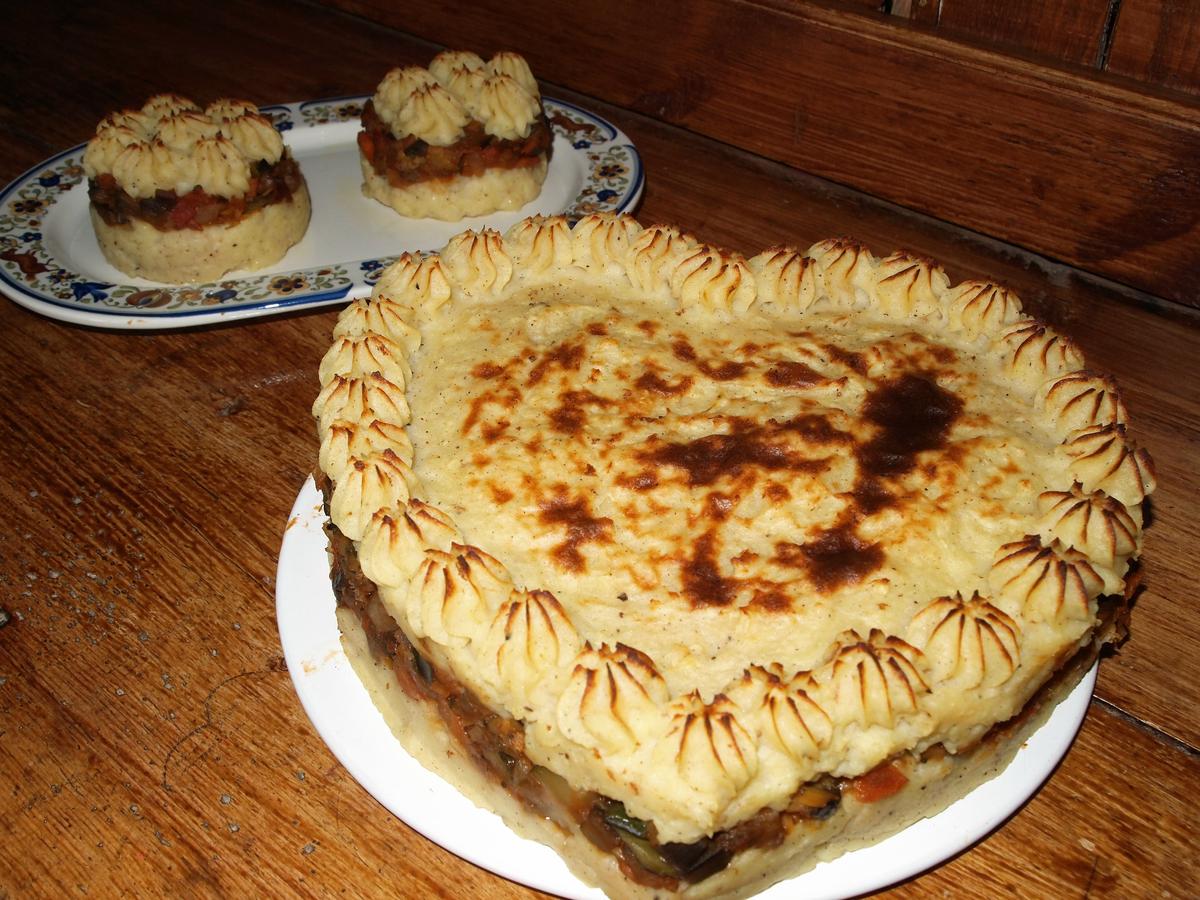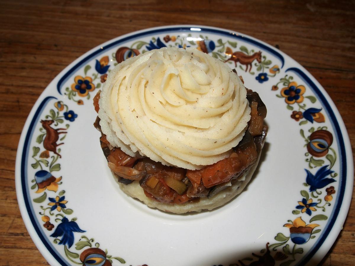 Decoración opcional: en una manga pastelera con una boquilla de estrella grande, rellenamos con puré de patatas y decoramos nuestro pastel o pastelitos. Luego lo gratinamos en el horno hasta que se dore un poco y listo.