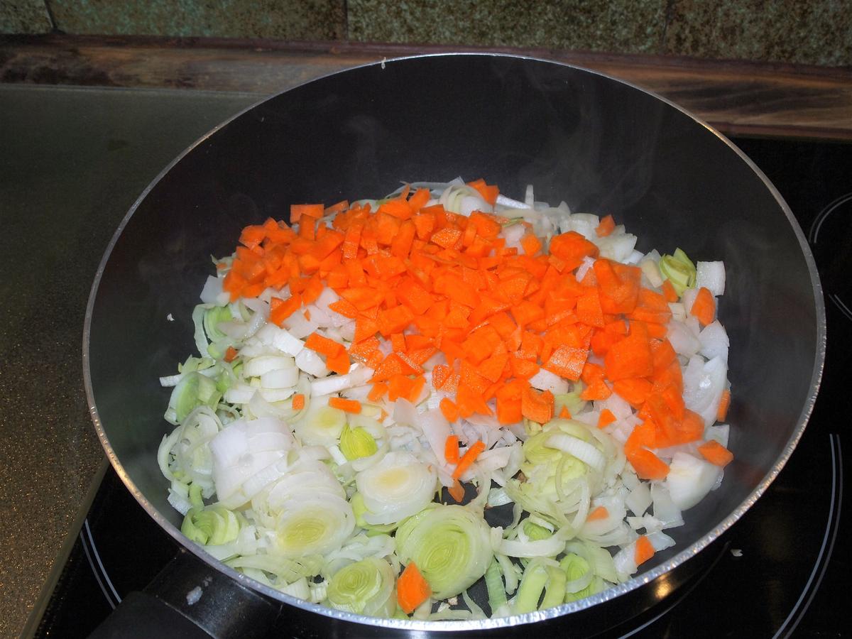 Entre tanto lavamos y cortamos los puerros, la cebolla, nabos y zanahorias. Cortamos finamente y rehogamos en una sartén grande con el vasito de vino tinto. Unos 7 minutos.